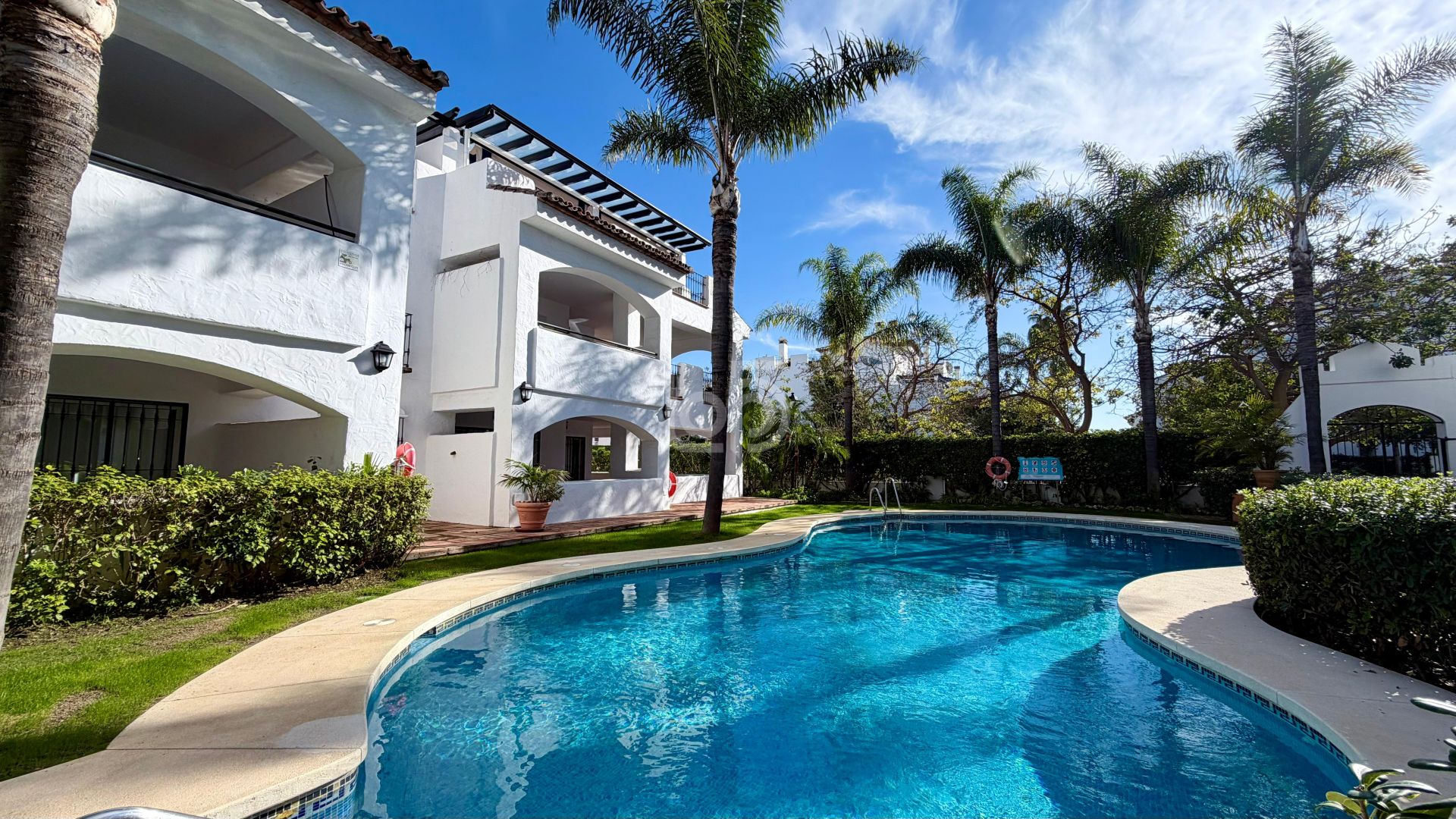 Квартира полностью меблирована и оснащена современными удобствами, такими как кондиционер, электрические жалюзи и встроенные шкафы. Жилая зона дополнена частной и крытой террасами, с которых открываются приятные виды на общий сад и бассейн. Жильцы могут пользоваться подогреваемым общим бассейном и ухоженными садами, что делает это место идеальным для отдыха и досуга. Для дополнительного удобства в собственности предусмотрены частный гараж, кладовая и отдельная прачечная.