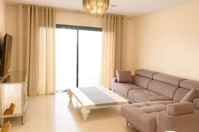 The apartment comprises two spacious bedrooms and two bathrooms, providing ample accommodation for residents and guests alike. The interiors are fully furnished, featuring double glazing and air conditioning throughout, ensuring a pleasant environment year-round. The open-plan living areas are complemented by expansive windows, offering delightful views over the communal gardens and creating a bright, inviting atmosphere.