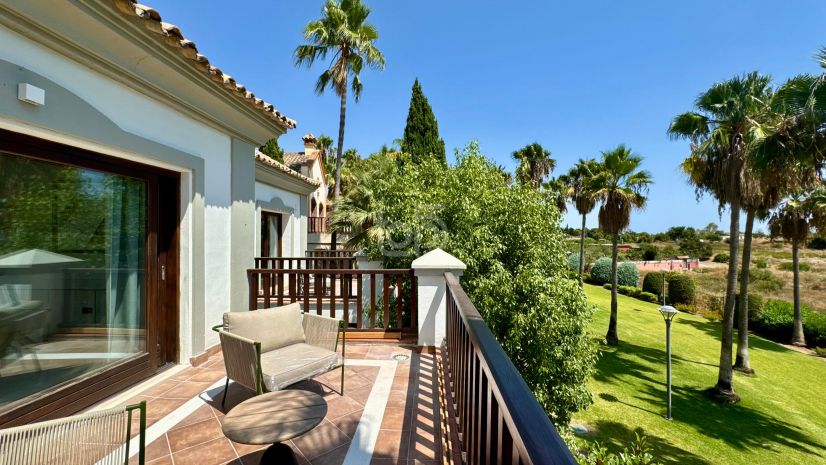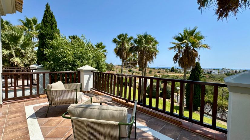 La villa dispone de cinco amplios dormitorios, seis baños completos (tres de ellos en suite) y un aseo adicional para invitados. El dormitorio principal cuenta con un elegante vestidor y acceso a una terraza privada con vistas parciales al mar. La vivienda incluye también un apartamento independiente para invitados, una oficina y una habitación de servicio, lo que la convierte en una opción ideal tanto para familias como para quienes buscan espacios versátiles y privacidad.